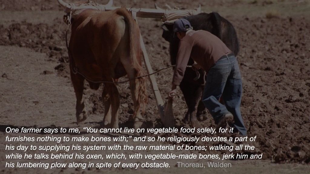 One farmer says to me, “You cannot live on vegetable food solely, for it furnishes nothing to make bones with;” and so he religiously devotes a part of his day to supplying his system with the raw material of bones; walking all the while he talks behind his oxen, which, with vegetable-made bones, jerk him and his lumbering plow along in spite of every obstacle. Thoreau, Walden