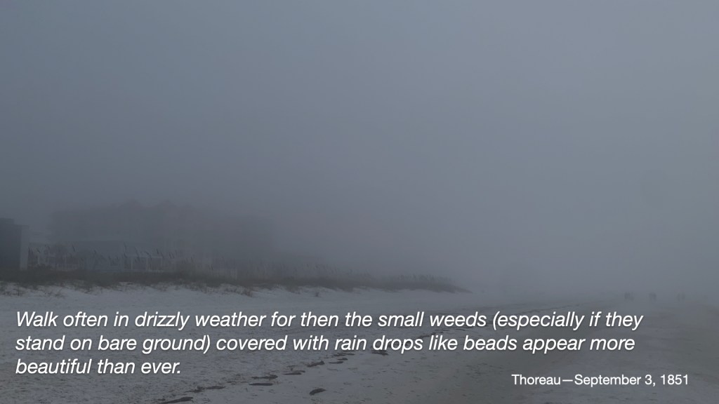 “Walk often in drizzly weather for then the small weeds (especially if they stand on bare ground) covered with rain drops like beads appear more beautiful than ever.”